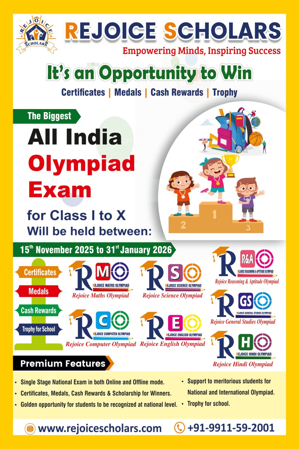 Rejoice Olympiad, organized by Rejoice Scholars, is a prestigious national-level competition designed for students of Class 1 to Class 10. It aims to identify, reward, and celebrate academic excellence across multiple subjects — giving young minds a platform to shine at the national and international levels.